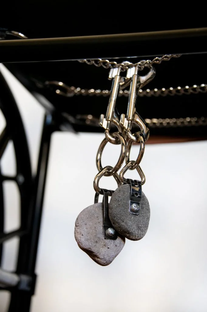 ABOUT THE WORKAnchored in an artistic study of Sheree Rose and Bob Flanagan collections at the ONE archives at the USC libraries, Ibarra explores sex, pleasure, illness, and disability through the use of leather to construct and fashion ‘bruised’ leather wheelchairs with port-a-catheter and pierced stones.