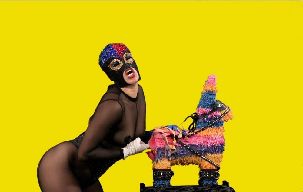 ABOUT THE WORKLa Dominatrix del Barrio es una película que aborda una de las performances o spictacles de más larga data dentro del repertorio de burlesque de La Chica Boom/Xandra Ibarra. El término spictacle fue acuñado por la artista para describir su trabajo de performance i; en estas performances, readapta humorísticamente y eróticamente la iconografía Mexicana/Chican@. En La Dominatrix del Barrio, Ibarra aborda la fascinación turística con los shows de burros en la frontera de El Paso (USA) / Juárez (México). Ibarra transforma piñatas en objetos sexuales con voluntad y la máscara de lucha libre en atuendo propio de BDSM.
